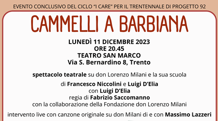 Nell'autunno di quest'anno il ciclo di iniziative culturali, artistiche e formative è stato intitolato “I care”, come tributo al centenario della nascita di don Lorenzo Milani, figura educativa che ha ispirato tante realtà sociali ed educative del nostro Paese, inclusa la cooperativa Progetto 92. "Con un gruppo di educatori, educatrici, ragazzi e ragazze dei servizi e progetti - viene spiegato - siamo andati a Barbiana per una visita alla scuola di don Milani, alla ricerca delle radici del nostro educare. Ora concludiamo il ciclo "I care" proponendo uno spettacolo teatrale di notevole valore artistico, rivolto ad adulti, giovani e famiglie. "Cammelli a Barbiana" rilegge la storia del Priore attualizzandola nel nostro tempo".