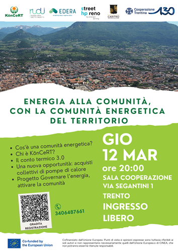 KönCeRT è da 3 anni che lavora nei territori del Trentino per formare comunità consapevoli dell’uso dell’energia e ha raggiunto proprio in questi giorni il traguardo di 420 soci, tutti appassionati sostenitori dell’iniziativa che porterà sul territorio benefici ambientali ed economici compreso l’aiuto ad alcune a attività sociali definite dai soci nella prossima assemblea generale. Un traguardo che pone KönCeRT fra le prime CER in Italia come seguito associativo. In questa serata oltre a spiegare cosa è una comunità energetica KönCeRT aggiornerà sulle prossime iniziative anche culturali.