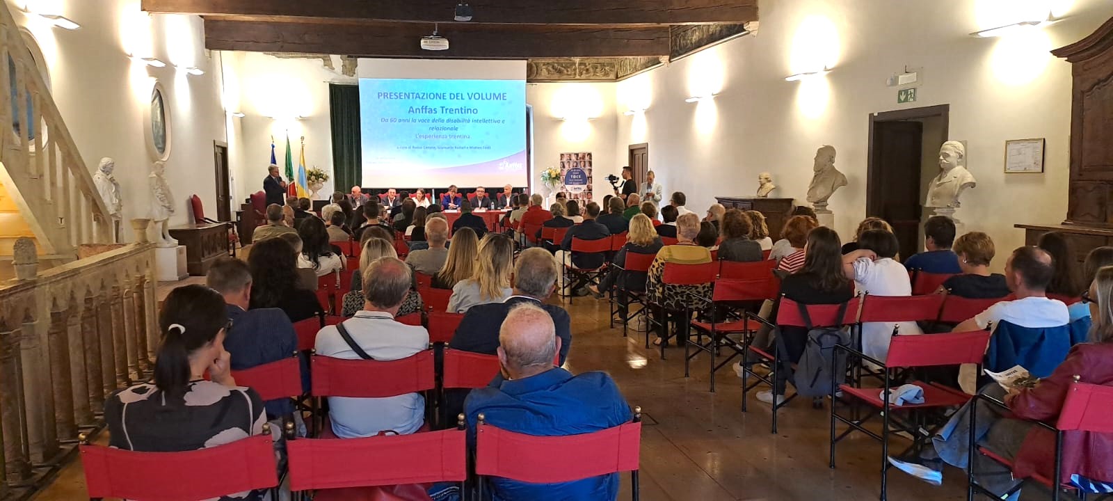 Sempre nella mattinata di oggi, alle ore 11.00, a Palazzo Trentini è stata inaugurata la mostra “Dalle origini, passaggi interiori. Un viaggio tra volti, sogni e silenzi nei 60 anni di Anffas Trentino” con le opere realizzate dagli artisti dei laboratori artisti di Anffas Trentino Articà. L’esposizione racconta, attraverso 6 sezioni tematiche, i momenti salienti della storia dell’associazione: un viaggio attraverso i luoghi e le persone significative che l’hanno costruita passo dopo passo. I ritratti di persone accompagnano il visitatore sulla scalinata verso Sala Aurora in cui le opere raffigurano l’attività artistica dei laboratori Articà, i padri fondatori e le madri fondatrici dell'associazione, l’impegno dei volontari e l’esperienza di Casa Serena. Nei quadri vengono rappresentate tante attività, dai soggiorni estivi ai vari servizi del territorio, con intensità, gioia ed energia. La mostra darà visitabile fino a 26 settembre, dalle 9 alle 18. Il presidente del Consiglio provinciale di Trento, Claudio Soini, ha fatto gli onori di casa facendo tanti auguri e complimenti ad Anffas Trentino per il traguardo raggiunto ed esprimendo il suo apprezzamento sia per la pubblicazione del volume sull'associazione, sia per i contenuti della mostra ospitata in sala Aurora. “Un'esposizione - ha detto - che racconta tante storie e parla di volontariato, di luoghi felici, parla soprattutto di persone. Accogliere questa iniziativa di Anffas qui nella sede del parlamento trentino l'abbiamo trovato del tutto coerente con l'esposizione in corso a palazzo centrata sulla figura di Alcide De Gasperi”. Sono seguiti gli interventi della Presidente di Anffas Trentino Claudia Morelli, della responsabile di Anffas Trentino per le arti Maria Chiara Giorgi, della maestra d’arte Nadia Ongaro e di una delle artiste della mostra, Rosalia Matteotti. Entrambi gli eventi sono stati condotti da Diego Nart dell'area comunicazione e marketing della Federazione Trentina della Cooperazione.